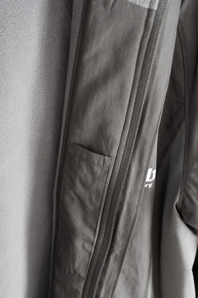 裏面がフリース素材であたたかく、かつスリムに着こなせるジャケット。表面には撥水加工が施されており、ストレッチ生地で動きやすいです。内側にはペン挿しも付いています。